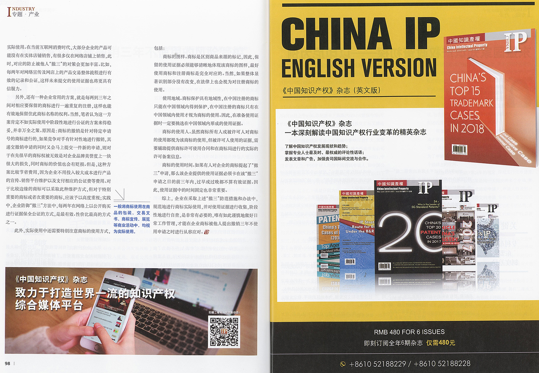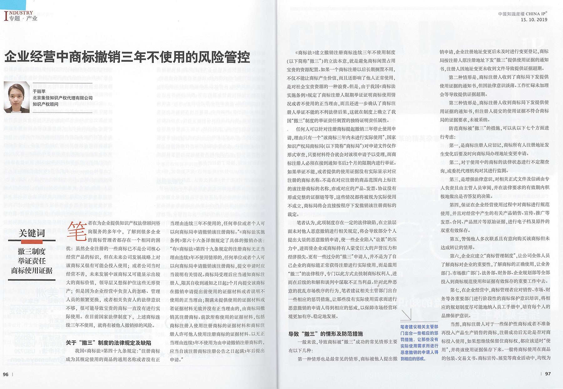 集佳文章《企業(yè)經(jīng)營中商標(biāo)撤銷三年不使用的風(fēng)險(xiǎn)管控》在《中國知識產(chǎn)權(quán)》 發(fā)表