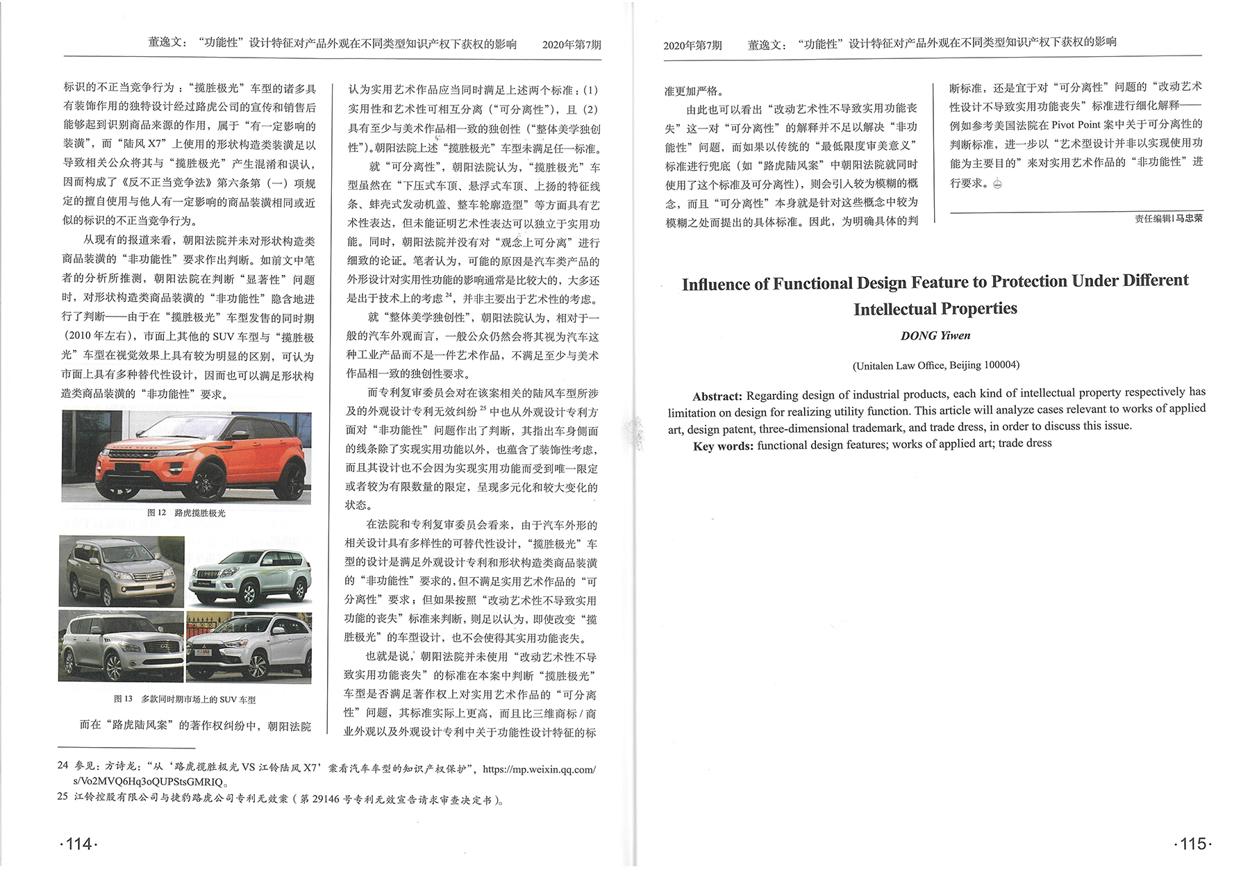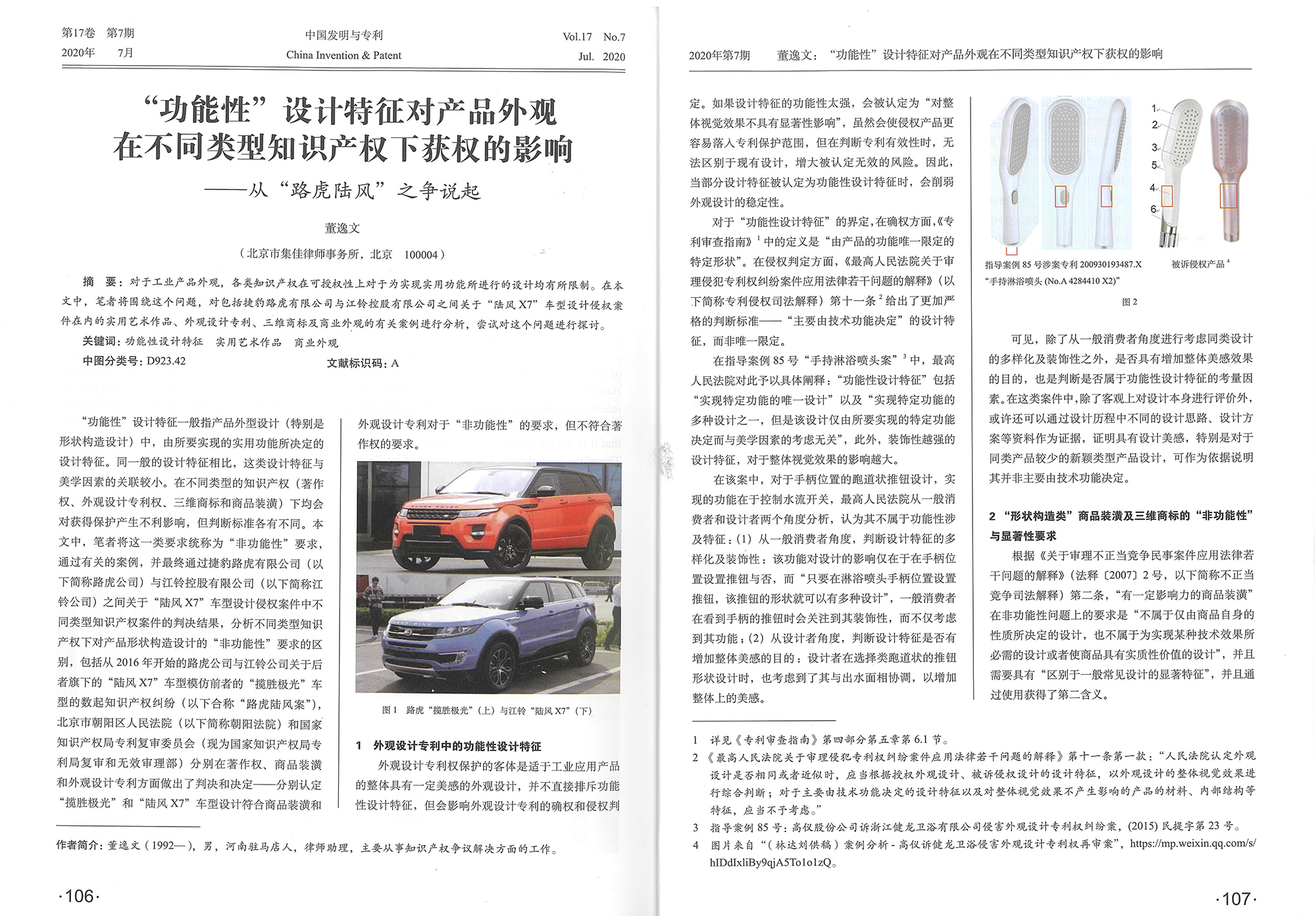 集佳文章《“功能性”設(shè)計(jì)特征對(duì)產(chǎn)品外觀在不同類型知識(shí)產(chǎn)權(quán)下獲權(quán)的影響——從“路虎陸風(fēng)”之爭(zhēng)說起》在《中國發(fā)明與專利》發(fā)表