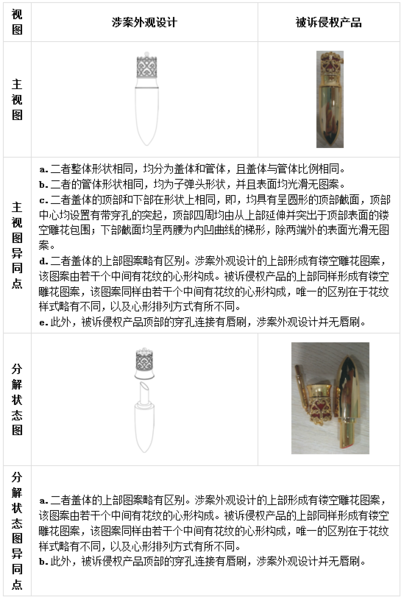 3、經(jīng)過比對(duì),被訴侵權(quán)產(chǎn)品設(shè)計(jì)與涉案專利的確存在以下兩點(diǎn)區(qū)別,即:(1)蓋體上鏤空雕花的具體圖案略有不同;(2)頂部穿孔處是否連接有唇刷。