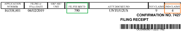 在USPTO發(fā)出的受理通知書上,可以看到官方認(rèn)定的獨立權(quán)利要求數(shù)為4,同時顯示官方收到的申請人費用(綠色方框),參見下圖: