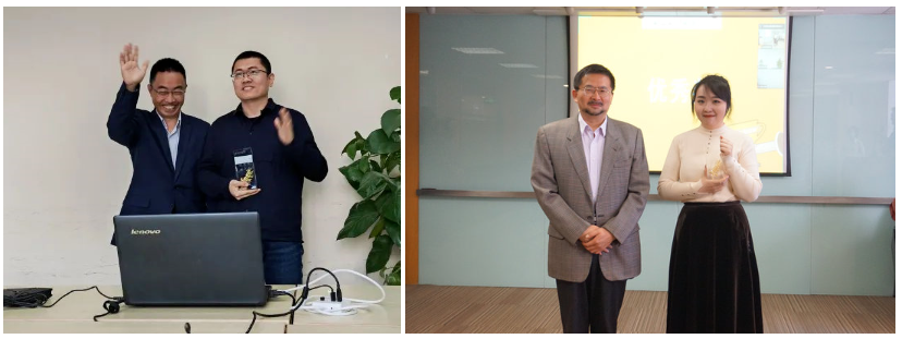 ▲ 楊林森老師為姚文杰頒獎(遠程會議連線) ▲丁永凡老師為蔣靜靜頒獎
