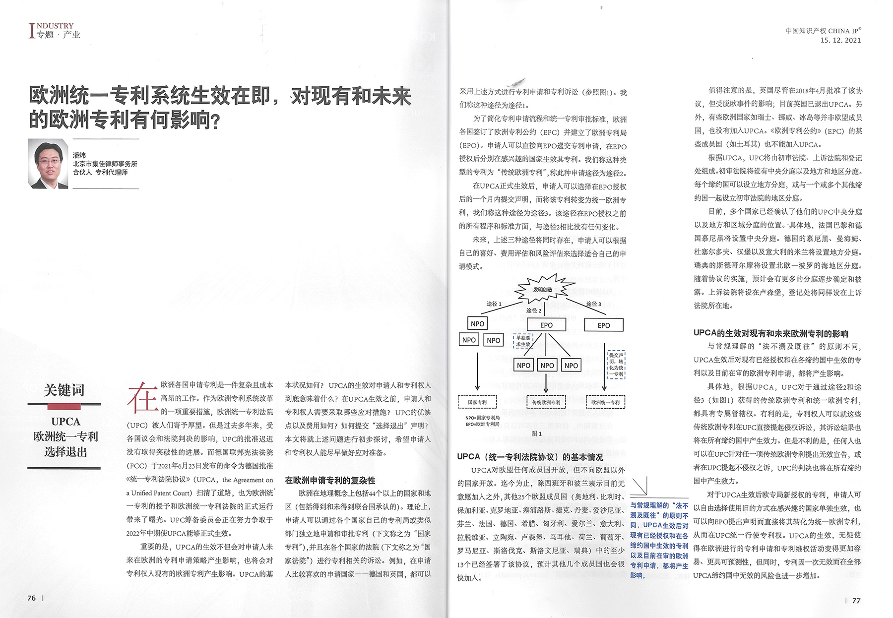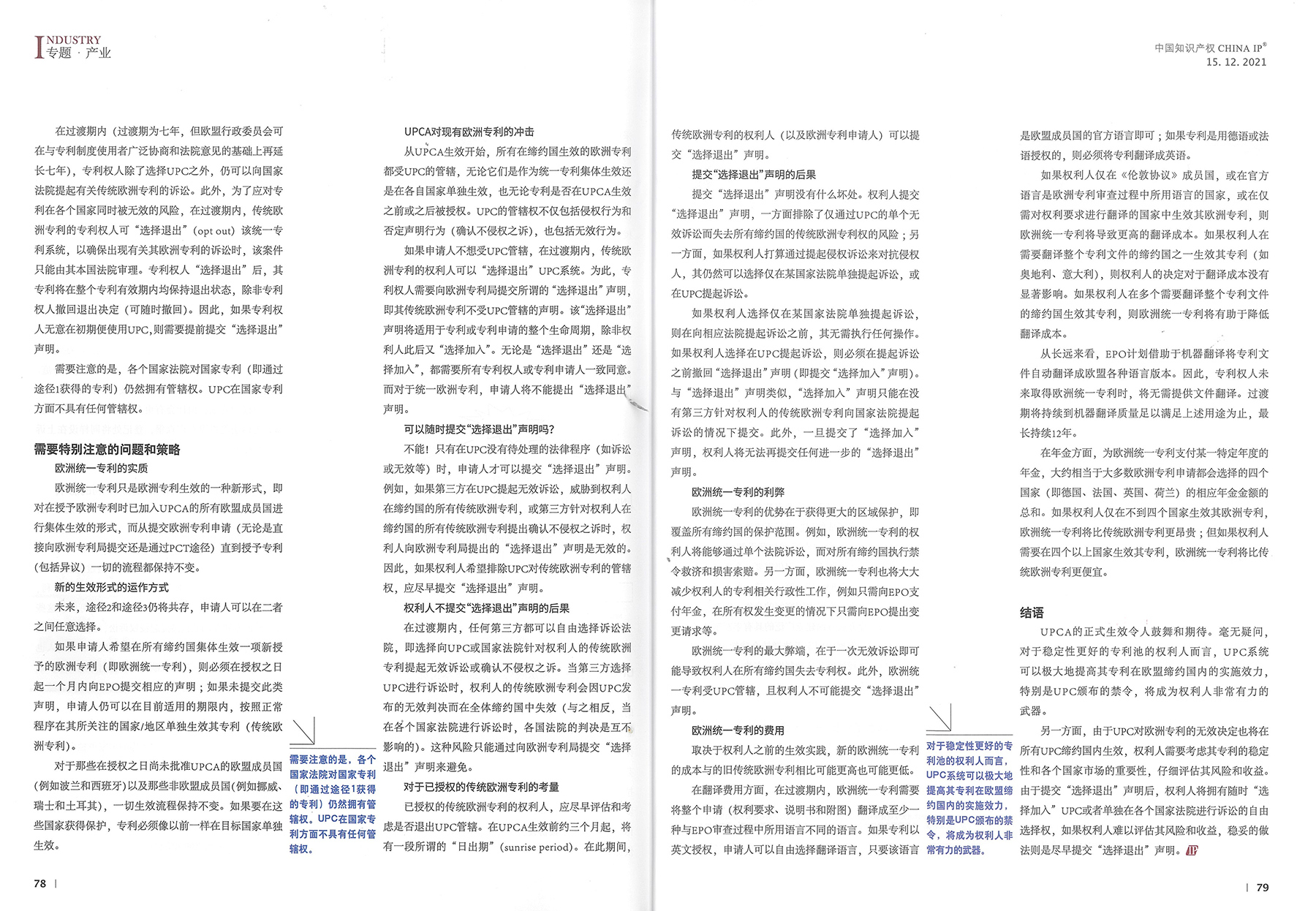 集佳文章《歐洲統(tǒng)一專利系統(tǒng)生效在即,對現(xiàn)有和未來的歐洲專利有何影響?》在《中國知識產權》發(fā)表