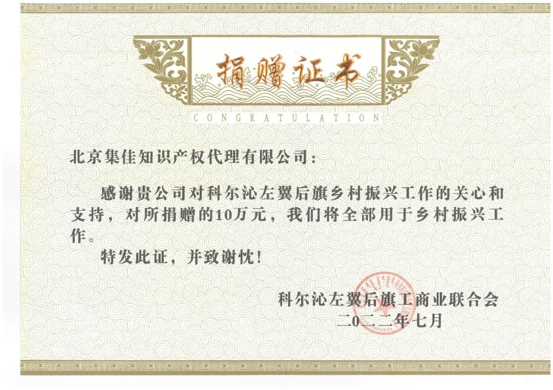 近日,集佳知識產(chǎn)權(quán)積極響應(yīng)朝陽區(qū)工商聯(lián)的鄉(xiāng)村振興幫扶倡議,捐資10萬元支持內(nèi)蒙古自治區(qū)科爾沁左翼后旗鄉(xiāng)村振興建設(shè),并收到科爾沁左翼后旗工商業(yè)聯(lián)合會的致謝。