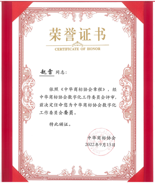 在本次論壇上,中華商標協會數字化工作委員會正式成立,并舉行揭牌儀式。《知識產權強國建設綱要(2021-2035年)》、《“十四五”國家知識產權保護和運用規(guī)劃》及《知識產權公共服務“十四五”規(guī)劃》等文件強調指出,要建立市場化、社會化的信息加工和服務機制,推動知識產權信息公共服務和市場化服務協調發(fā)展;要加強知識產權信息化、智能化基礎設施建設,推動知識產權數字化服務普惠應用。同時,對于企業(yè)和商標代理機構而言,如何在數字化時代進行高效的管理和溝通,做好品牌管理、預警和保護工作,一直都是市場主體的核心訴求。基于上述信息化和數字化的政策背景以及市場主體對數字化轉型的需求,中華商標協會成立“數字化工作委員會”,旨在促進行業(yè)數字化轉型升級,為貫徹上述《綱要》和《規(guī)劃》做出應有貢獻。會上,中華商標協會馬夫會長為首批數字化工作委員會的委員單位和委員頒發(fā)證書。集佳知識產權入選了首批數字化工作委員會委員單位,趙雷律師被任命為數字化工作委員會委員。