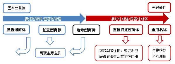 根據(jù)《審查指南》第1209.01條,商標(biāo)的描述性可被理解為一個(gè)“顯著性/描述性統(tǒng)一體”,也即商標(biāo)的顯著性和描述性是一個(gè)相對(duì)的概念,申請(qǐng)商標(biāo)在指定商品/服務(wù)上的描述性越強(qiáng),顯著性越弱。前述“顯著性/描述性統(tǒng)一體”以及商標(biāo)描述性程度劃分如下圖所示: