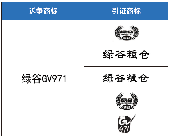 ”和引證商標1-4相比較,其中文部分僅為“綠谷”;即便其中還包含“GV971”,但是整體上沒有形成能夠和引證商標區(qū)分開的含義。訴爭商標和引證商標5相比較,“GV971”部分完全相同,即便其中還包含“綠谷”,但依然很容易被視為雙方存在特定關(guān)聯(lián)。