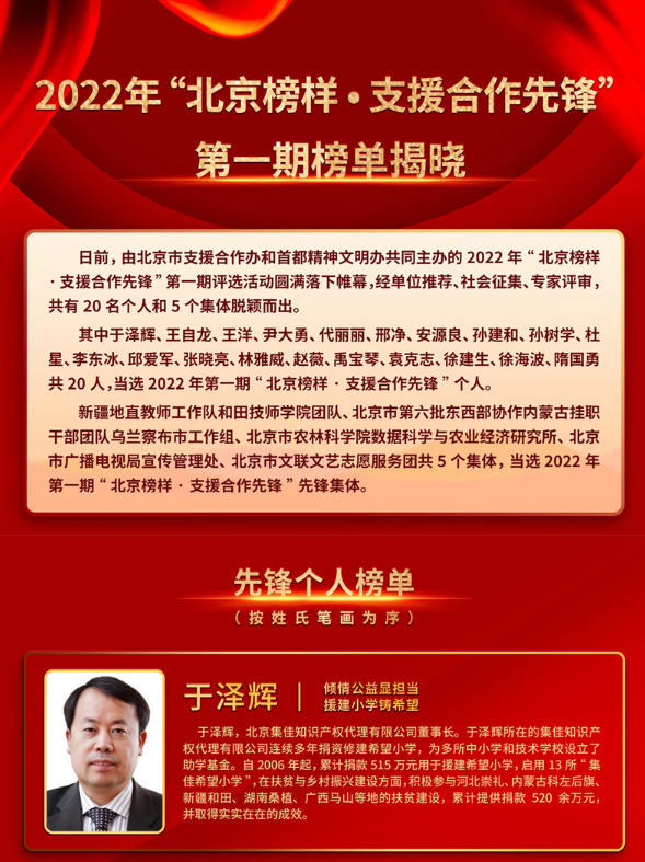 近日,由北京市支援合作辦公室和首都精神文明辦公室共同主辦的2022年“北京榜樣?支援合作先鋒”第一期評(píng)選活動(dòng)圓滿落下帷幕,經(jīng)單位推薦、社會(huì)征集、專家評(píng)審,共有20名個(gè)人和5個(gè)集體脫穎而出,集佳于澤輝所長榮登“先鋒個(gè)人榜單”!