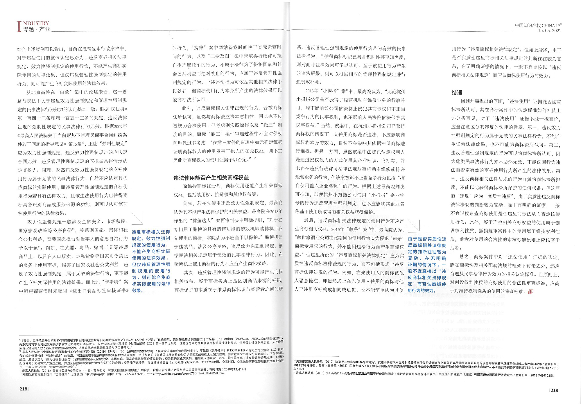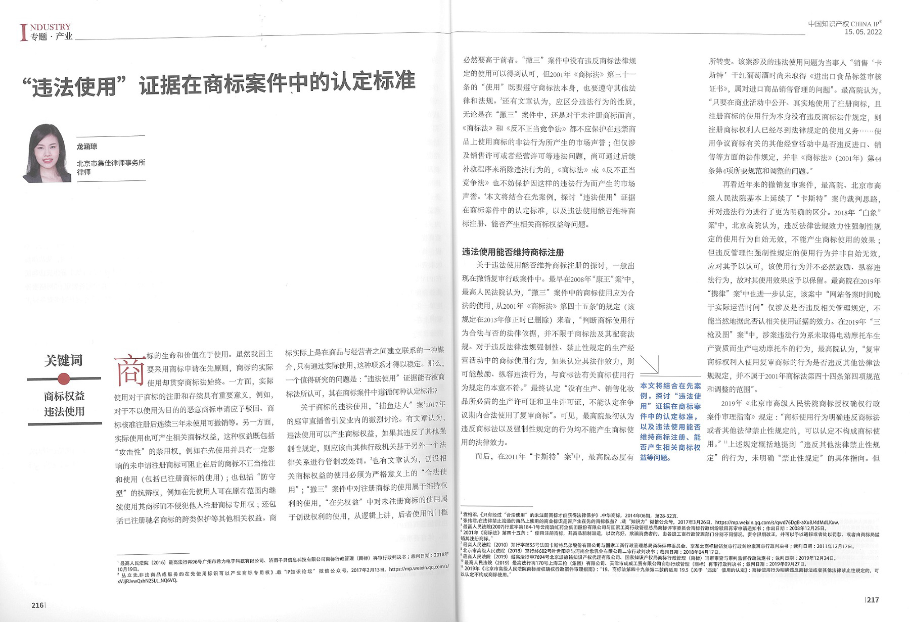 集佳文章《“違法使用”證據(jù)在商標(biāo)案件中的認(rèn)定標(biāo)準(zhǔn)》在《中國(guó)知識(shí)產(chǎn)權(quán)》發(fā)表