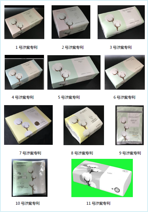 涉案專利均為棉柔巾產(chǎn)品的外包裝盒及外包裝袋,具有相似的設(shè)計元素和設(shè)計風(fēng)格。其中,10件專利的申請日為2017年6月5日,1件專利的申請日為2019年1月10日,所有專利均未對外觀設(shè)計的顏色予以保護(hù)。