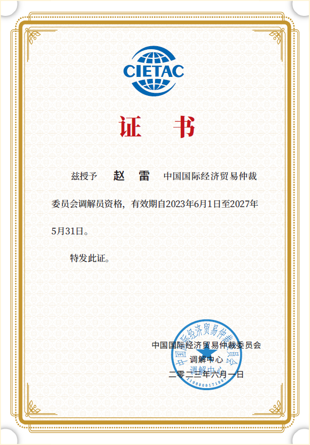 近日,集佳高級(jí)合伙人趙雷律師受聘擔(dān)任中國(guó)國(guó)際經(jīng)濟(jì)貿(mào)易仲裁委員會(huì)新一屆調(diào)解員。