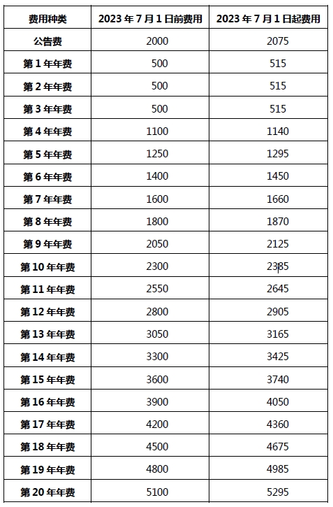 *續(xù)展費的調(diào)整適用于2023年9月30日之后到期的費用。這意味著在2023年9月30日之前到期的續(xù)展費仍按2023年7月1日之前的標(biāo)準(zhǔn)繳納。如果逾期支付費用,將收取20%的滯納金。