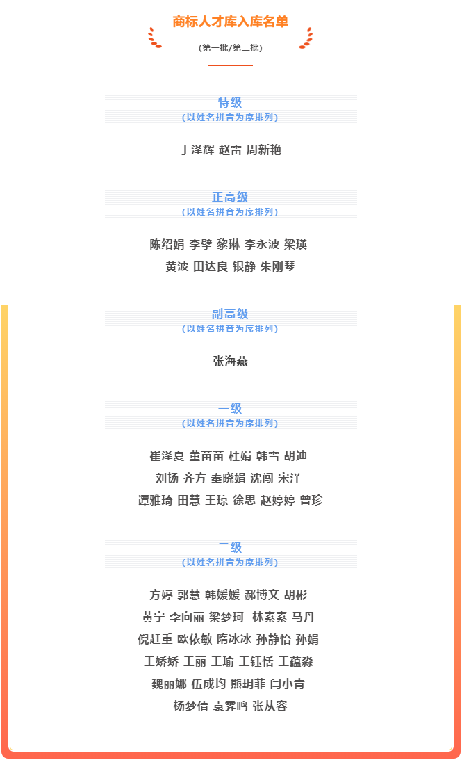 集佳多位商標(biāo)代理人入選了中華商標(biāo)協(xié)會商標(biāo)人才庫,代表行業(yè)對集佳知識產(chǎn)權(quán)代理質(zhì)量與專業(yè)能力的全面肯定。集佳始終秉持“造就中國優(yōu)秀的知識產(chǎn)權(quán)人才”的理念,在努力提升自身實力的同時,也一直致力于為行業(yè)源源不斷地輸送優(yōu)秀資源。今后,集佳將繼續(xù)以高標(biāo)準(zhǔn)建設(shè)高質(zhì)量的人才隊伍,以高品質(zhì)的專業(yè)能力,為廣大客戶提供更加優(yōu)質(zhì)、高效的法律服務(wù)。