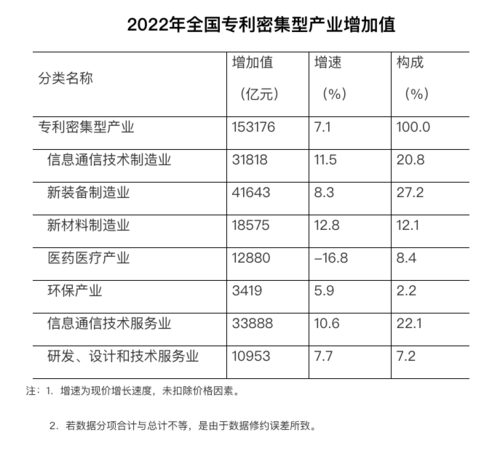 經(jīng)核算,2022年全國專利密集型產業(yè)增加值為153176億元,比上年增長7.1%(未扣除價格因素,下同);占GDP的比重為12.71%,比上年提高0.27個百分點。