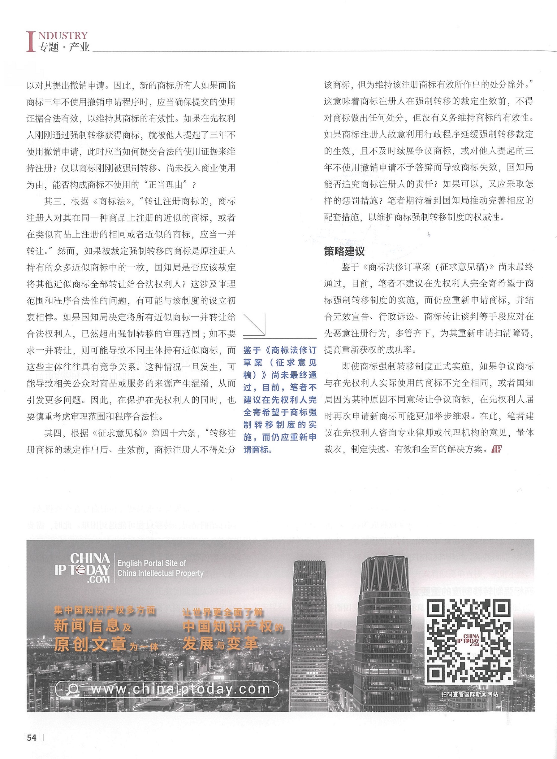 集佳文章《淺析<商標(biāo)法修訂草案(征求意見稿)>中的商標(biāo)強(qiáng)制轉(zhuǎn)移制度》在《中國(guó)知識(shí)產(chǎn)權(quán)》發(fā)表