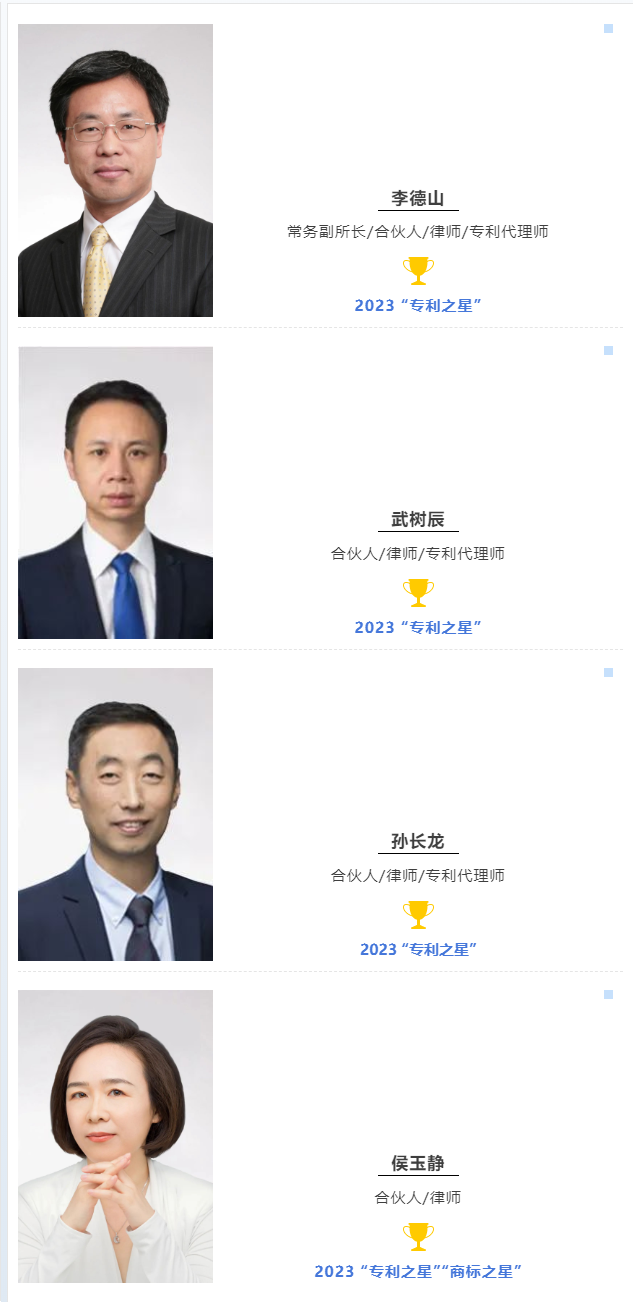 同時(shí),李德山副所長(zhǎng)、武樹辰律師、孫長(zhǎng)龍律師和侯玉靜律師因其在各自領(lǐng)域的卓越實(shí)力和杰出表現(xiàn),分別獲評(píng)2023 IP Stars“專利之星”“商標(biāo)之星”美譽(yù)。