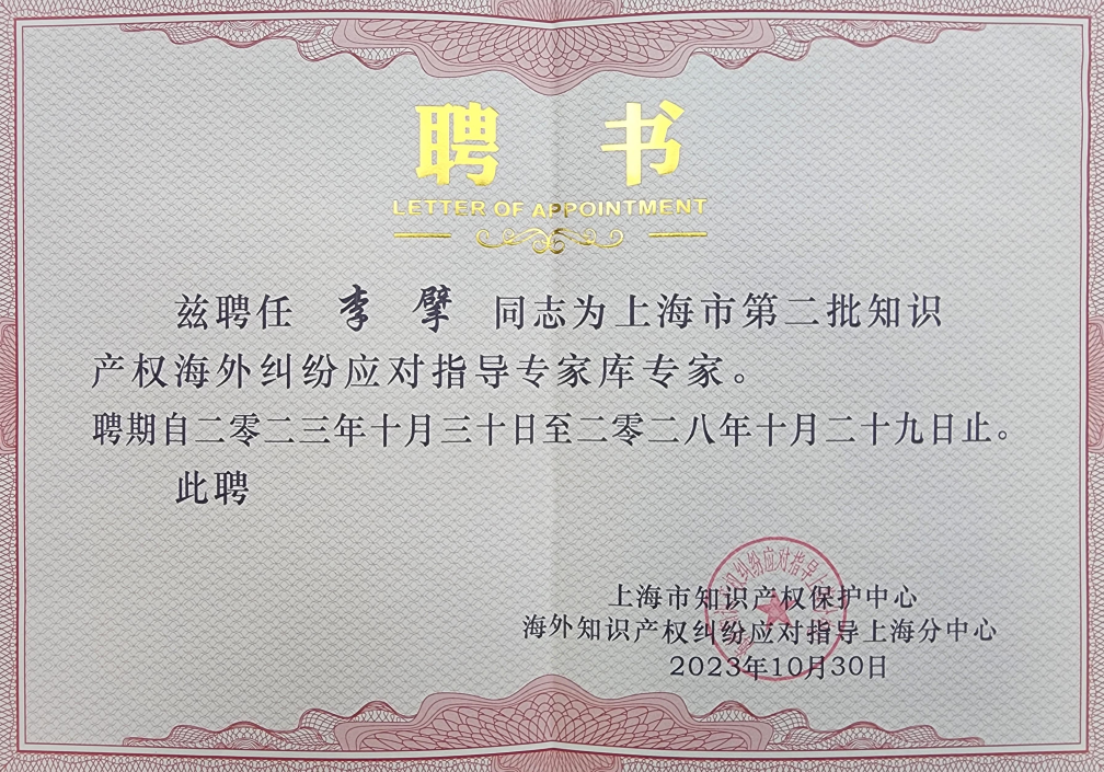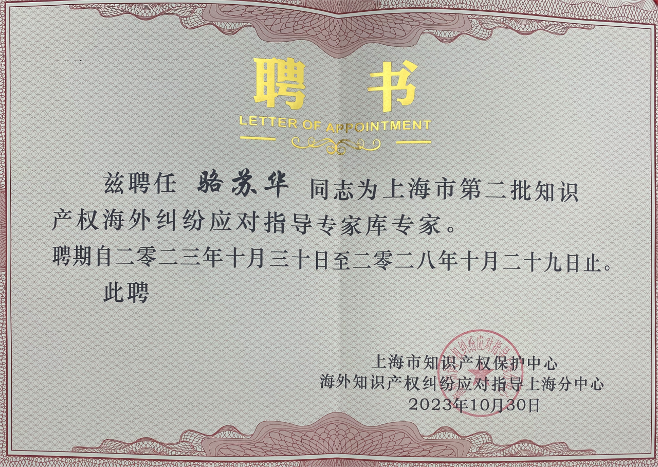 集佳上海分所合伙人駱蘇華博士、合伙人李擘律師獲聘成為上海市知識(shí)產(chǎn)權(quán)保護(hù)中心第二批海外維權(quán)援助專(zhuān)家(上海市第二批知識(shí)產(chǎn)權(quán)海外糾紛應(yīng)對(duì)指導(dǎo)專(zhuān)家?guī)鞂?zhuān)家)暨虹橋國(guó)際中央商務(wù)區(qū)海外維權(quán)援助基地首批專(zhuān)家。
