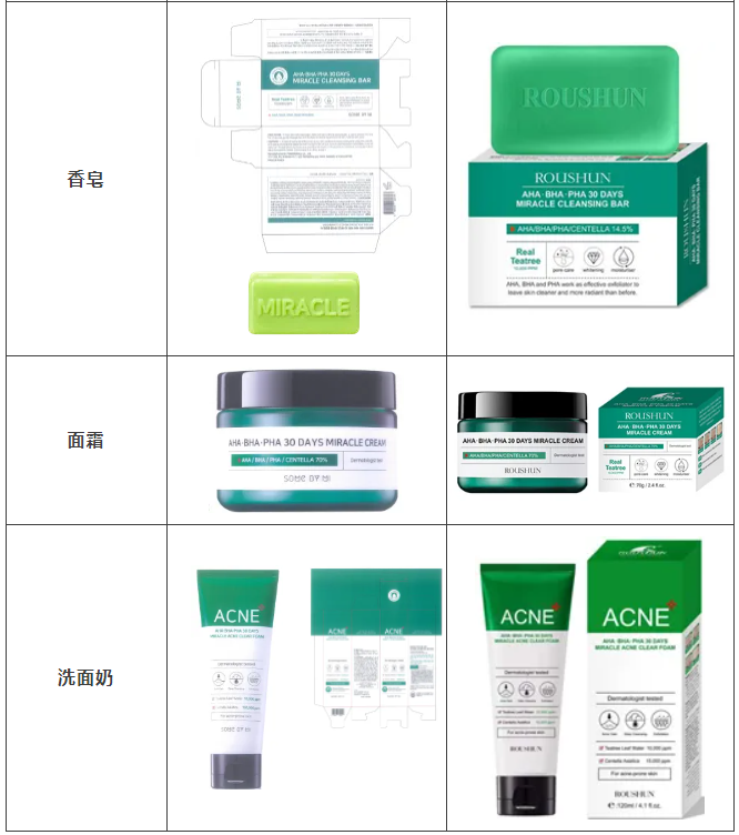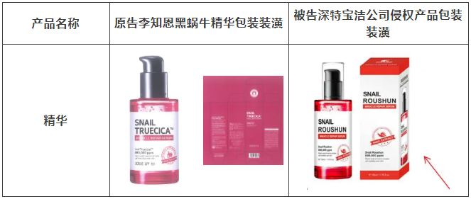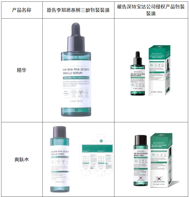2021年原告委托北京市集佳律師事務(wù)所調(diào)查發(fā)現(xiàn),被告汕頭市深特寶潔實業(yè)有限公司生產(chǎn)、銷售和推廣的“茶樹祛痘美白補水液”“茶樹香皂”等護膚品,其產(chǎn)品包裝裝潢直接抄襲、摹仿原告前述已經(jīng)具有較高知名度和影響力的“SOME BY MI/莎柏蜜”茶樹三酸系列化妝品和黑蝸牛精華液的包裝、裝潢設(shè)計,使用與之近似的標(biāo)識,造成消費者混淆誤認。故原告作為茶樹三酸、黑蝸牛精華包裝裝潢權(quán)益獲益人,訴至廣東省汕頭市中級人民法院。汕頭中院認定:李知恩主張的茶樹三酸、黑蝸牛精華包裝裝潢構(gòu)成具有一定影響的包裝裝潢,深特寶潔公司生產(chǎn)、銷售茶樹三酸、黑蝸牛精華液的行為構(gòu)成不正當(dāng)競爭。因判賠額不符合原告預(yù)期,原告后上訴至廣東省高級人民法院,廣東省高級人民法院最終維持一審判決。