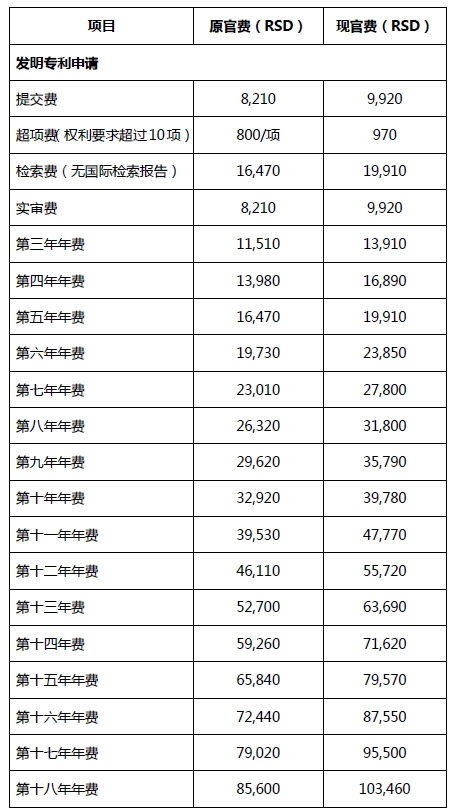 2024年8月1日起,塞爾維亞上調(diào)與知識產(chǎn)權(quán)相關(guān)的官費,上調(diào)幅度約為5%,與發(fā)明和實用新型專利申請相關(guān)的官費如下: