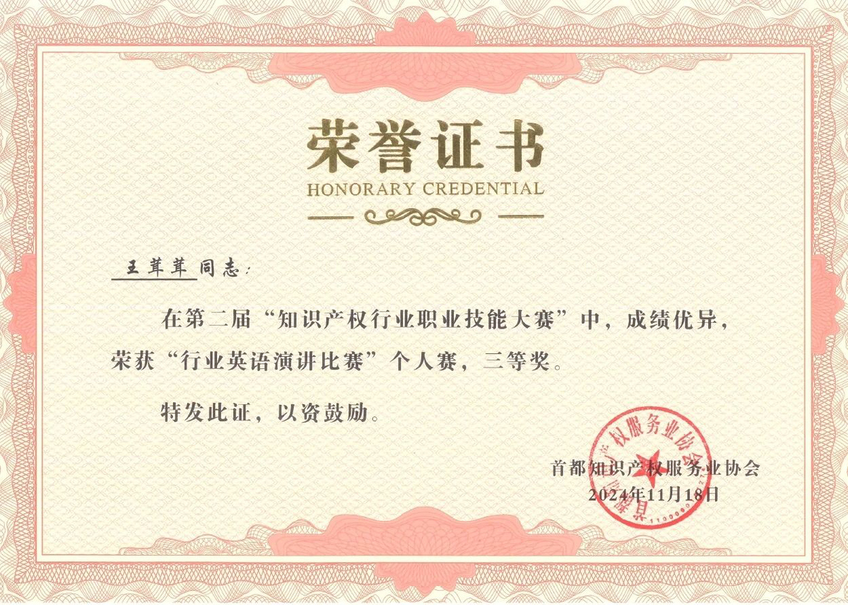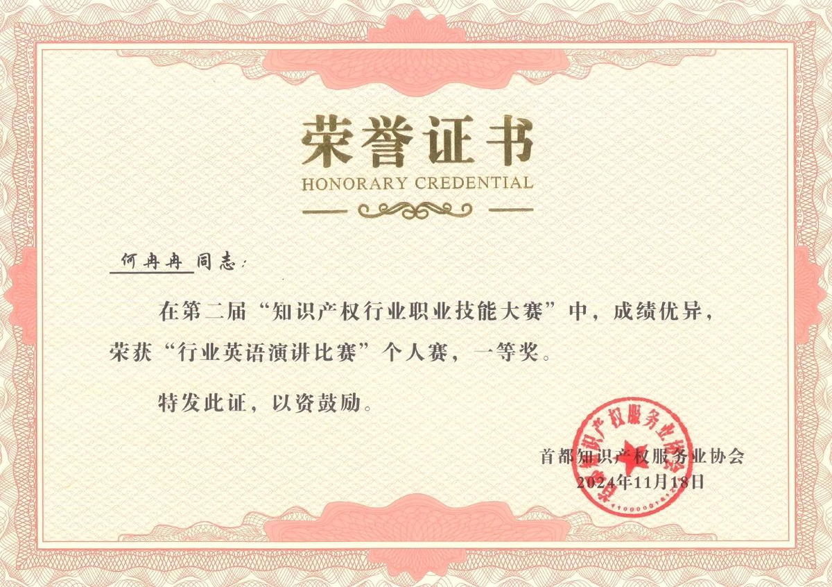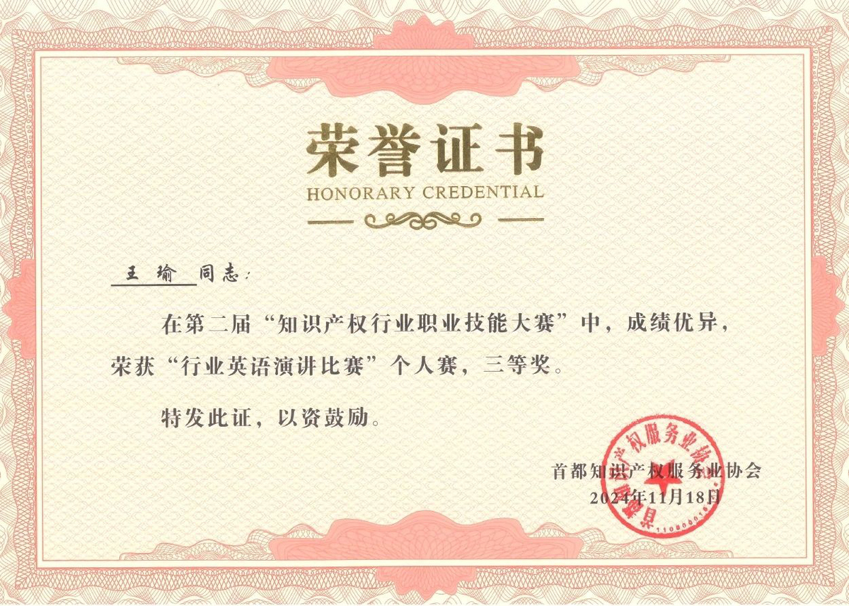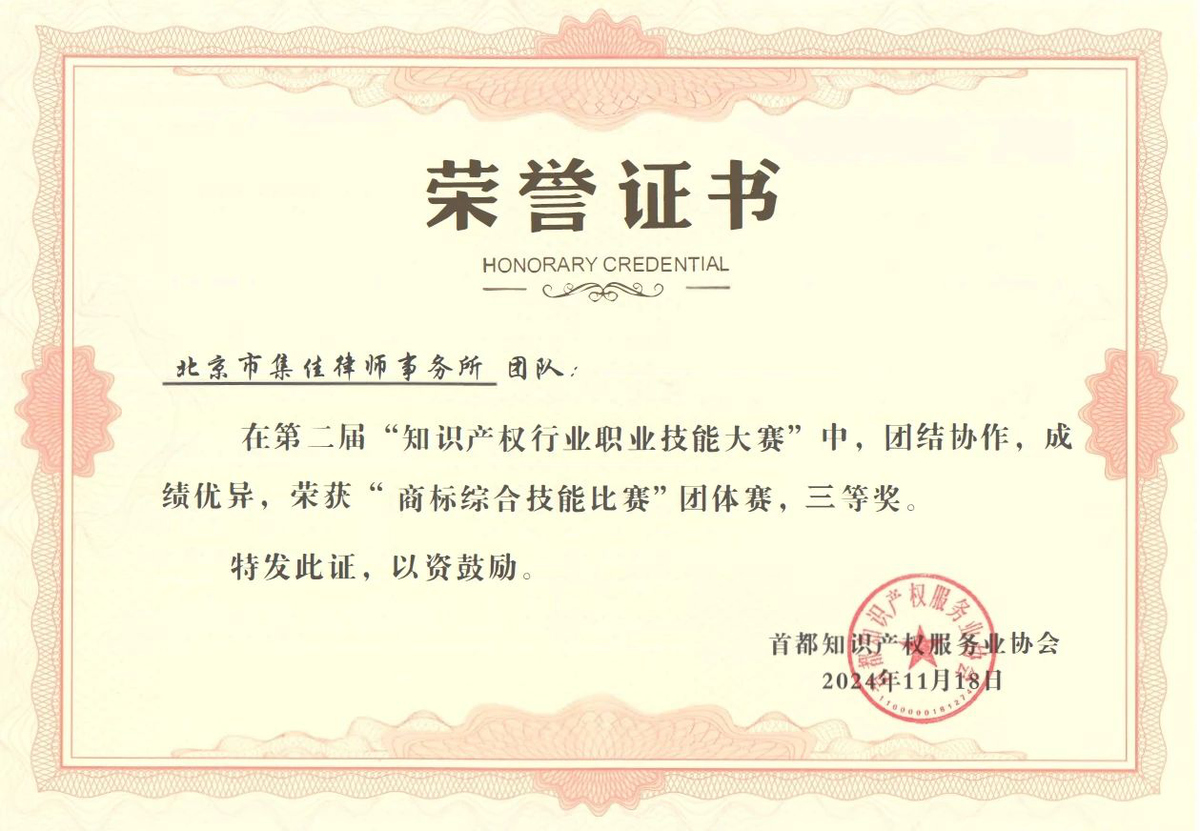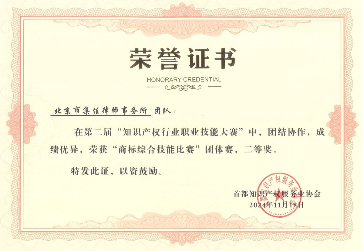 近日,在北京市知識(shí)產(chǎn)權(quán)局、海淀區(qū)市場(chǎng)監(jiān)督管理局(區(qū)知識(shí)產(chǎn)權(quán)局)的指導(dǎo)下,由首都知識(shí)產(chǎn)權(quán)服務(wù)業(yè)協(xié)會(huì)主辦,中國(guó)知識(shí)產(chǎn)權(quán)研究會(huì)專利專業(yè)委員會(huì)、北京(中關(guān)村)國(guó)際知識(shí)產(chǎn)權(quán)服務(wù)大廳承辦的第二屆“知識(shí)產(chǎn)權(quán)行業(yè)職業(yè)技能大賽”圓滿落幕,集佳多位代理人與商標(biāo)參賽團(tuán)隊(duì)在本屆大賽中斬獲多項(xiàng)佳績(jī)。在“行業(yè)英語(yǔ)演講比賽”個(gè)人賽中,何冉冉力戰(zhàn)群雄,拔得頭籌榮獲一等獎(jiǎng),王茸茸、王瑜榮獲三等獎(jiǎng);在商標(biāo)綜合技能比賽中,集佳參賽的兩支隊(duì)伍均取得優(yōu)異成績(jī),由黎琳、趙敏敏、張雅靜三位組成的隊(duì)伍獲得二等獎(jiǎng),由李晴、伍君、曾珍三位組成的隊(duì)伍獲得三等獎(jiǎng)。