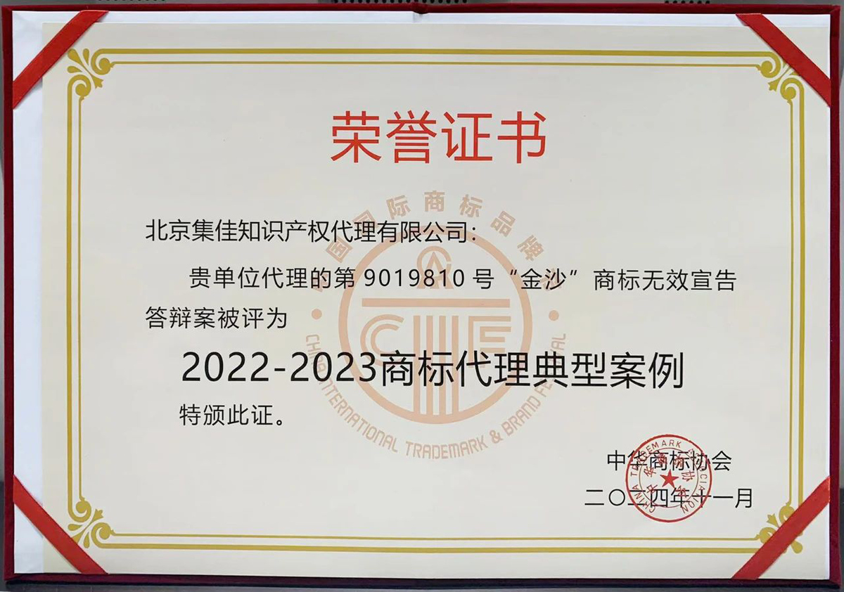 2024年11月24日下午,在商標(biāo)節(jié)經(jīng)典論壇之一的商標(biāo)典型案例評(píng)析會(huì)議上,北京市集佳律師事務(wù)所代理的“金沙”商標(biāo)權(quán)無(wú)效宣告答辯案入選“2022-2023商標(biāo)代理典型案例”。