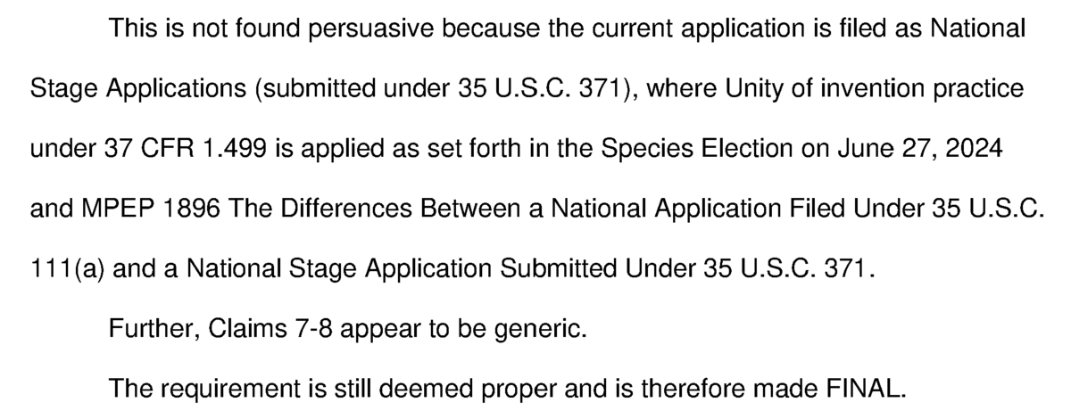 MPEP § 803 規(guī)定“If the search and examination of all the claims in an application can be made without serious burden, the examiner must examine them on the merits, even though they include claims to independent or distinct inventions”,即,如果可以在沒(méi)有嚴(yán)重負(fù)擔(dān)的情況下對(duì)申請(qǐng)中的所有權(quán)利要求進(jìn)行檢索和審查,則審查員必須根據(jù)案情對(duì)其進(jìn)行審查,即使它們包括獨(dú)立或不同發(fā)明的權(quán)利要求。如果申請(qǐng)人對(duì)RR的回復(fù)是帶有爭(zhēng)辯的(with traverse),該爭(zhēng)辯可以保留未來(lái)對(duì)RR進(jìn)行申訴的權(quán)利,且審查員需要對(duì)該爭(zhēng)辯做出回應(yīng)。這樣的回應(yīng)可能是審查員同意撤回RR,然而,更可能的是審查員發(fā)出Final RR,維持前次的RR意見(jiàn),審查員通常在Final RR中僅對(duì)RR的理由稍作調(diào)整。