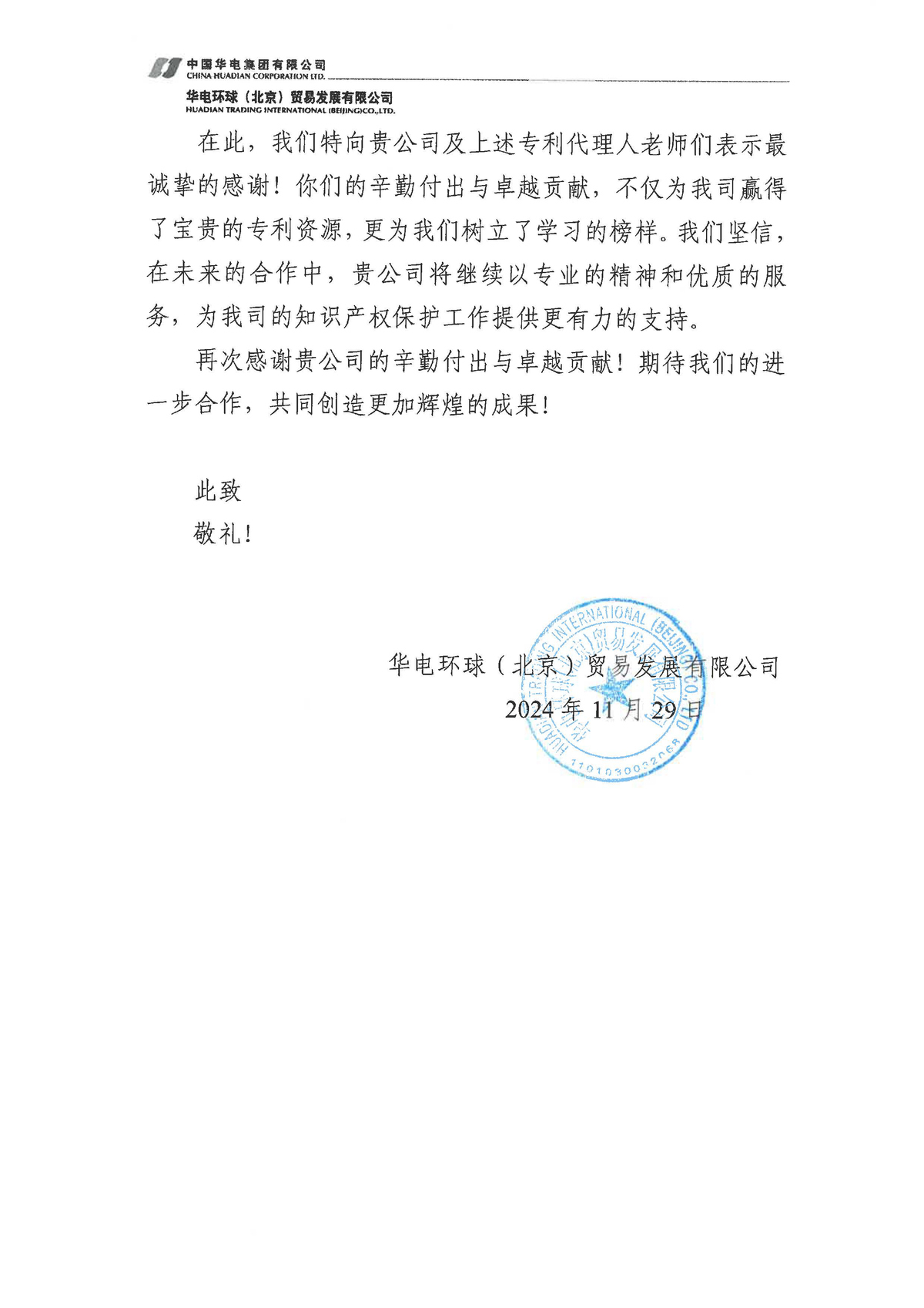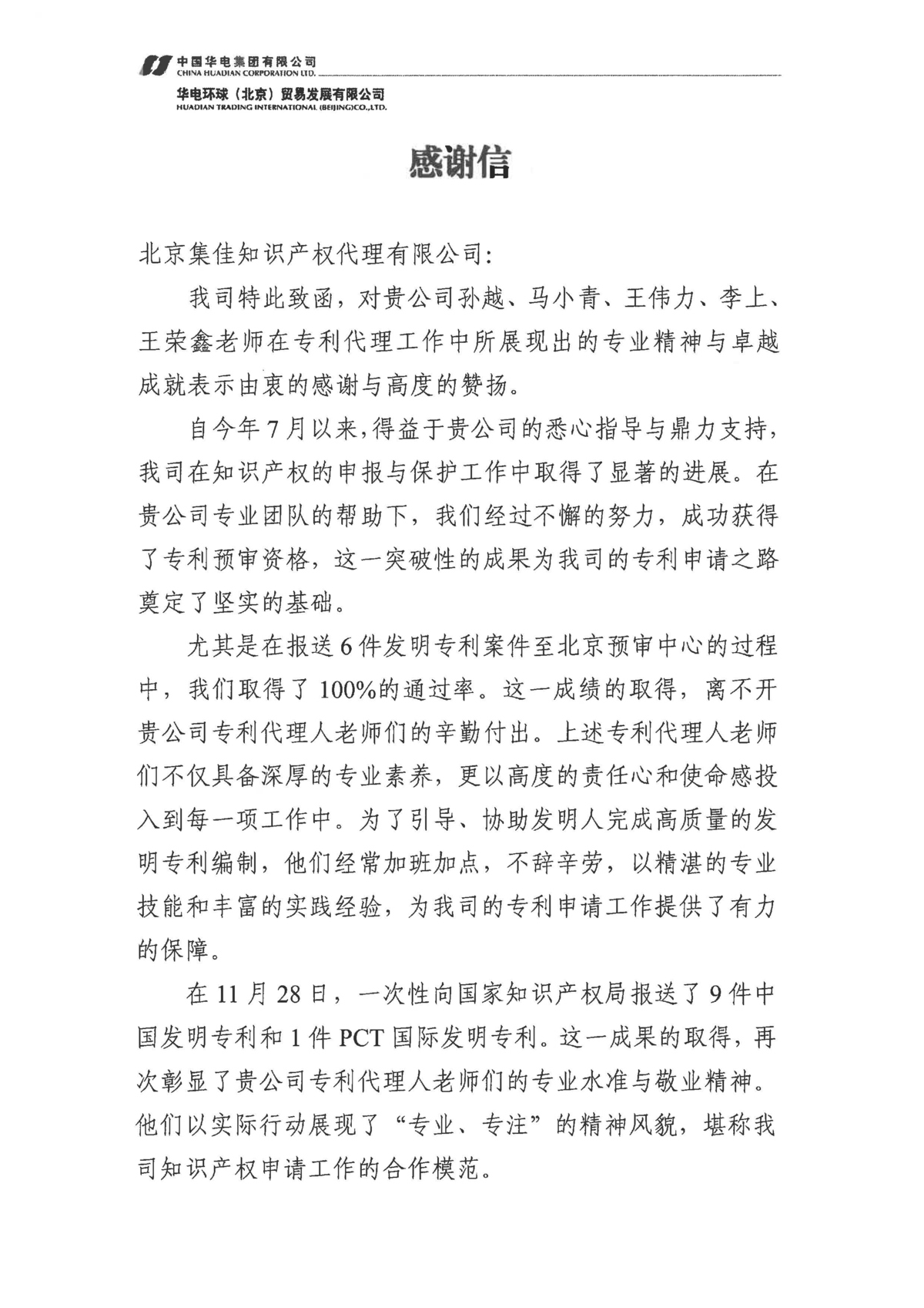 近日,集佳收到客戶華電環(huán)球(北京)貿(mào)易發(fā)展有限公司的感謝信,對(duì)集佳在知識(shí)產(chǎn)權(quán)申報(bào)與保護(hù)工作中給予的專業(yè)指導(dǎo)與大力支持表示由衷感謝,同時(shí)對(duì)集佳孫越、馬小青、王偉力、李上、王榮鑫等專業(yè)人員在專利代理工作中所展現(xiàn)出的專業(yè)精神與卓越成就表示高度贊揚(yáng)!