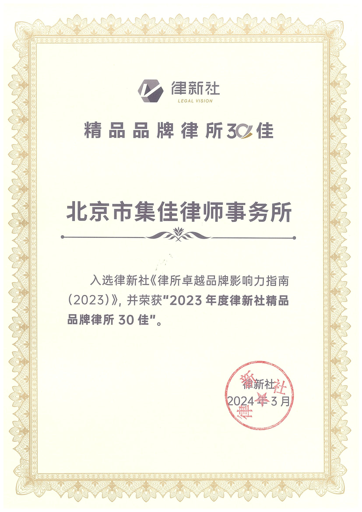 集佳律所入選 “2023年度律新社精品品牌律所30佳” 集佳喜獲客戶陽光電源授予“優(yōu)秀合作伙伴”榮譽稱號