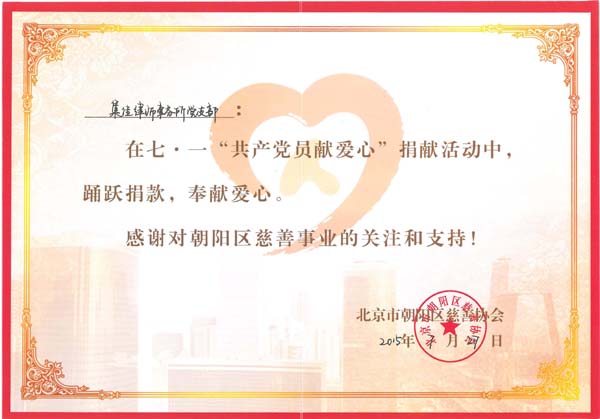 為充分發(fā)揮共產(chǎn)黨員的先鋒模范作用,集佳律師事務(wù)所積極響應(yīng)朝陽區(qū)律協(xié)開展的“共產(chǎn)黨員獻(xiàn)愛心活動(dòng)”,在活動(dòng)中積極踴躍的奉獻(xiàn)自己的愛心,得到了朝陽律協(xié)黨政的肯定與贊揚(yáng)。集佳黨員將繼續(xù)發(fā)揮模范作用并堅(jiān)持為社會(huì)做貢獻(xiàn)。
