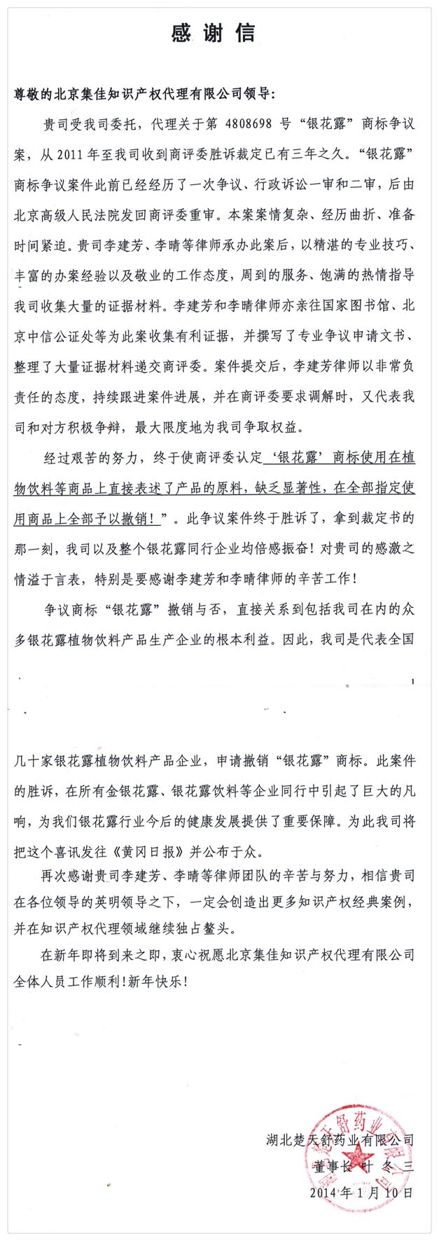 在新年即將到來之際,湖北楚天舒藥業(yè)有限公司給集佳發(fā)來感謝信,并提前祝福集佳全體人員新年快樂,工作順利。 集佳律師曾代理該公司第4808698 號"銀花露"商標爭議案獲得全面勝利。該案案情復(fù)雜、經(jīng)歷曲折、準備時間緊迫,該案的勝訴,在所有金銀花露、銀花露飲料等企業(yè)同行中引起了巨大的凡響,為銀花露行業(yè)今后的健康發(fā)展提供了重要保障。