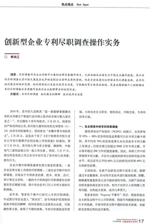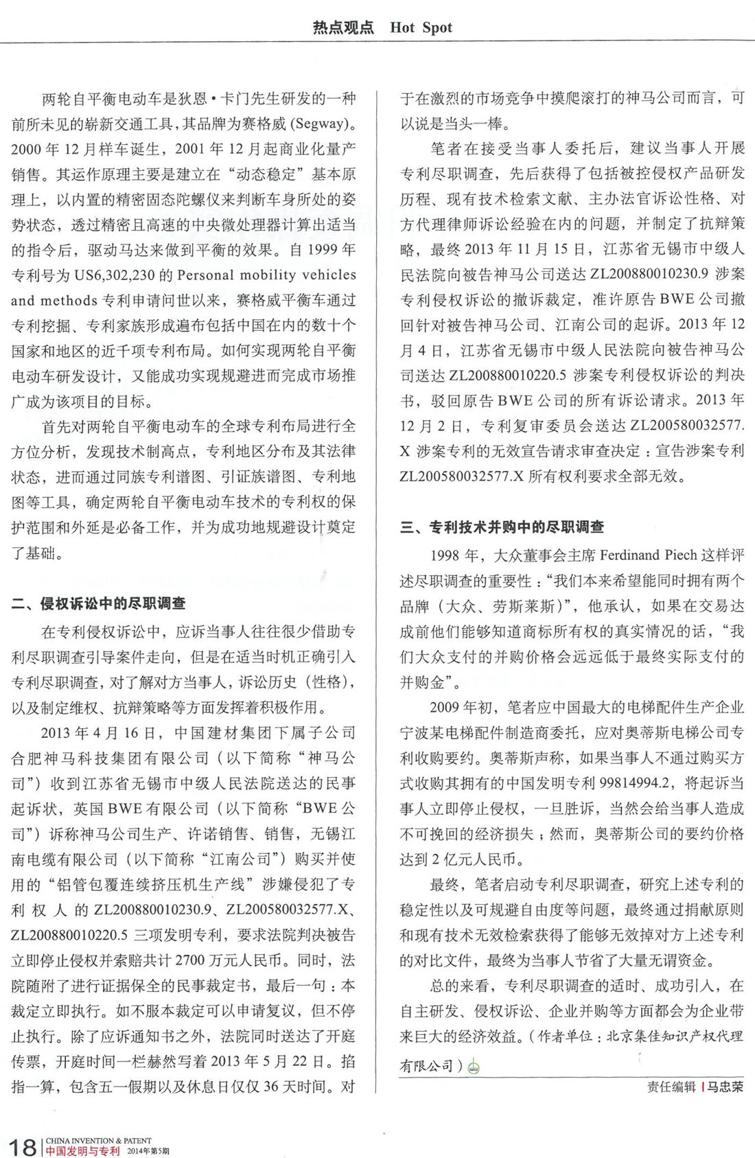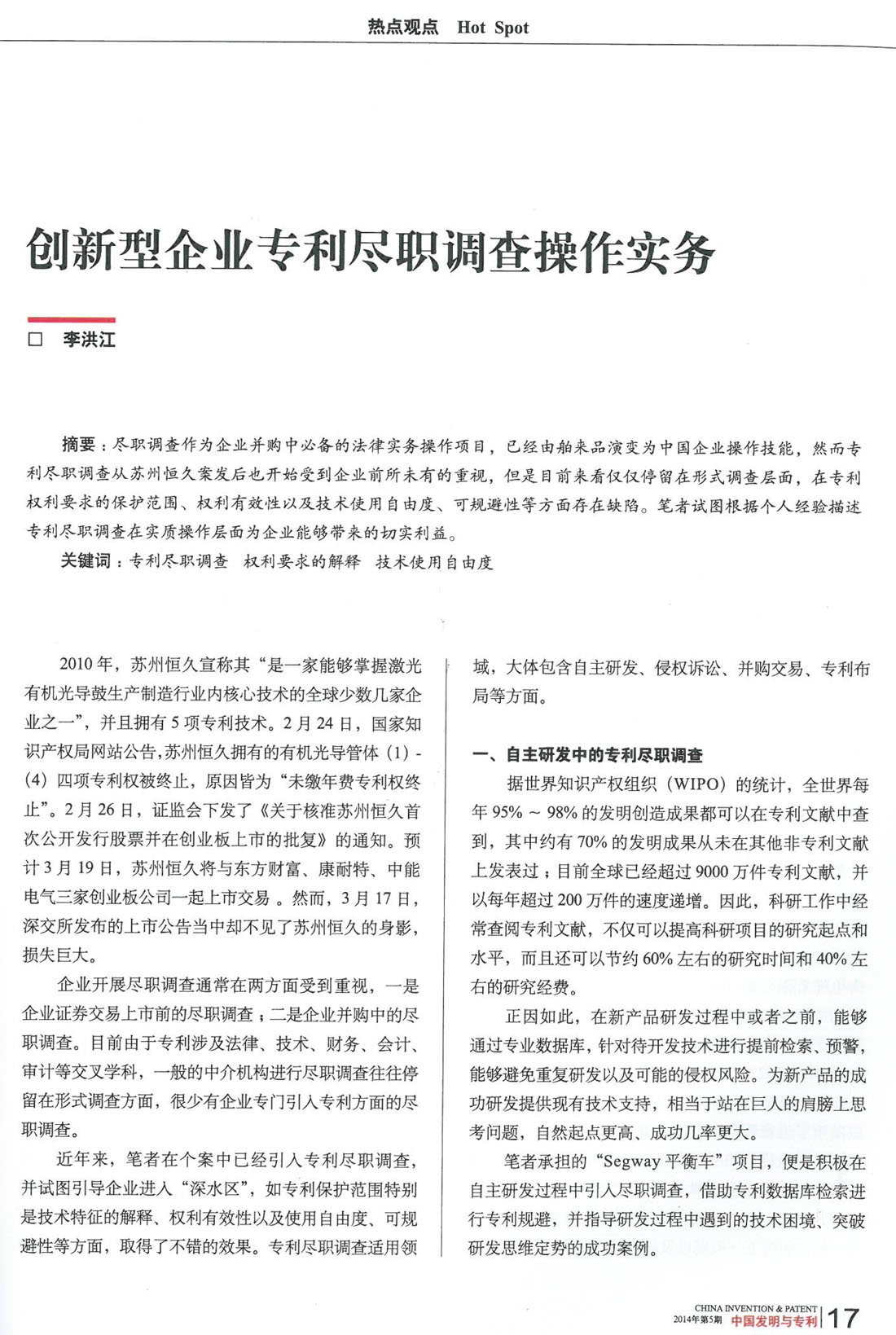 集佳律師撰文《創(chuàng)新性企業(yè)專利盡職調(diào)查操作實(shí)務(wù)》被《中國(guó)發(fā)明與專利》發(fā)表