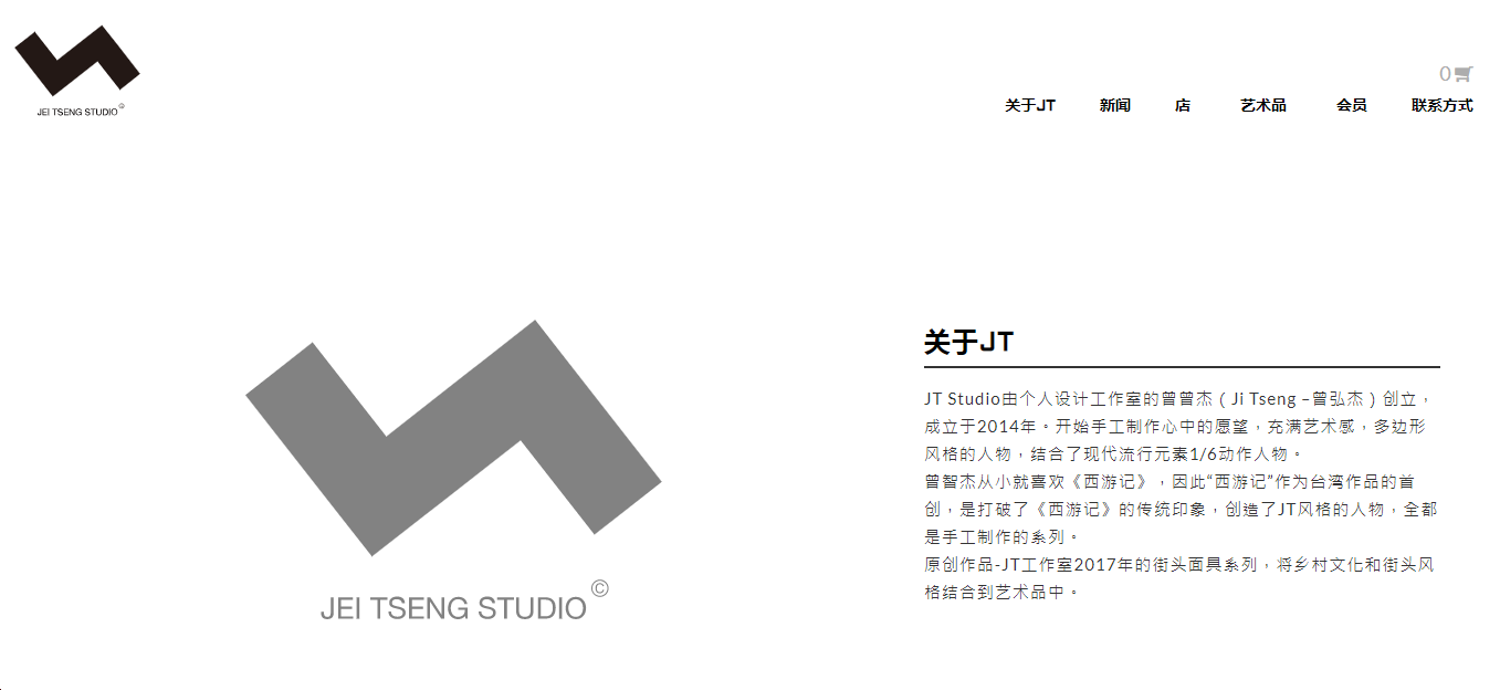 站酷ZCOOL網(wǎng)站中作者主頁顯示個(gè)人工作室官方網(wǎng)站為www.jtstudio.com.tw,異議人隨案提供了異議人個(gè)人工作室官網(wǎng)打印件,官網(wǎng)首頁顯示如下信息:JT Studio由個(gè)人設(shè)計(jì)工作室的曾弘杰(Jei Tseng 曾弘杰)創(chuàng)立,成立于2014年。開始手工制作心中的愿望,充滿藝術(shù)感,多邊形風(fēng)格的人物,結(jié)合了現(xiàn)代流行元素1/6動(dòng)作人物。曾弘杰從小就喜歡《西游記》,因此“西游記”作為臺(tái)灣作品的首創(chuàng),是打破了《西游記》的傳統(tǒng)印象,創(chuàng)造了JT風(fēng)格的人物,全都是手工制作的系列。原創(chuàng)作品-JT工作室2017年的街頭面具系列,將鄉(xiāng)村文化和街頭風(fēng)格結(jié)合到藝術(shù)品中。