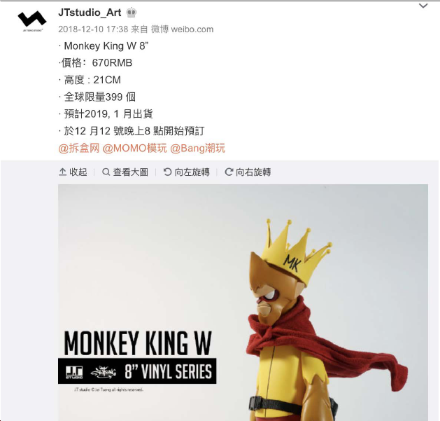 異議人站酷ZCOOL網(wǎng)站的個(gè)人主頁(https://www.zcool.com.cn/u/2732656/profile#tab_anchor)顯示,J.T studio是由異議人曾弘杰(英文名Jei Tseng)2014年在中國臺(tái)灣所創(chuàng)立的個(gè)人工作室,曾弘杰畢業(yè)于設(shè)計(jì)學(xué)院,喜歡畫畫及創(chuàng)作,自幼就很喜歡西游記的故事,因此將西游記系列作為第一個(gè)系列作品,將現(xiàn)代流行元素結(jié)合中國文化、漫畫風(fēng)格的手工藝術(shù)創(chuàng)作。異議人在站酷ZCOOL網(wǎng)站擁有11371位粉絲,人氣值高達(dá)1887444。