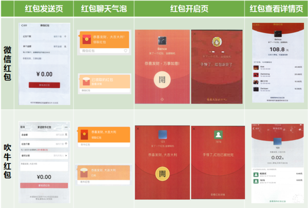 本案緣于被訴“吹牛”軟件在提供的紅包收發(fā)服務(wù)過程中,在紅包發(fā)送接收全過程中使用的紅包發(fā)送頁、開啟頁、聊天氣泡、查看詳情頁等界面全面抄襲、模仿原告“微信紅包”相關(guān)界面。此外“吹牛”軟件中還提供與騰訊公司享有在先著作權(quán)的六幅“微信表情”一致的聊天表情,且其使用與“微信”軟件底部界面“聊天、通訊錄、發(fā)現(xiàn)、我”圖標(biāo)高度近似的圖標(biāo)。